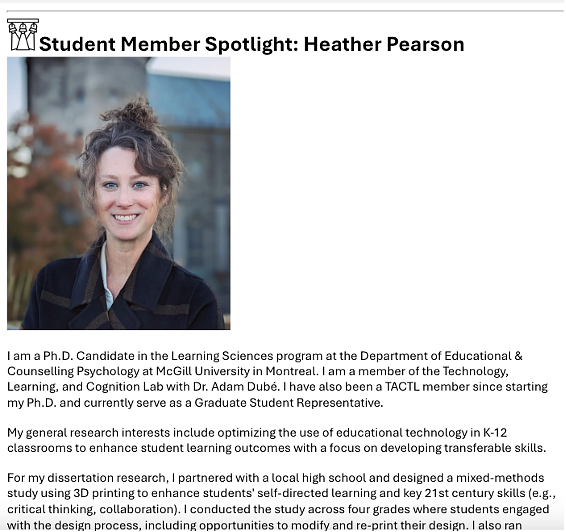 As the AERA TACTL SIG Student Representative, TLC Member Heather Pearson was selected by the TACTL Committee to be the first “Student Member Spotlight” in the bi-monthly newsletter.