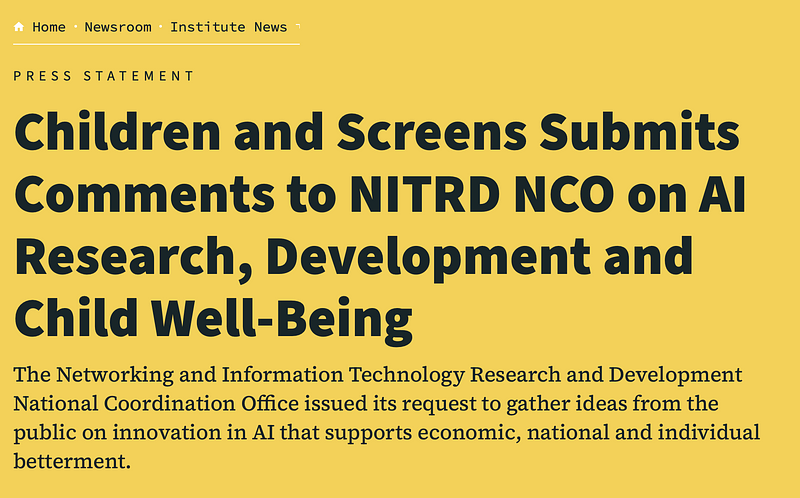 We are proud to share that Nandini Bharadwaj has co-authored a report for Children & Screen's Institute of Digital Media and Child Development. The report was submitted to the U.S. National Science Foundation (NSF) to inform the development of a national AI research agenda that prioritizes children's needs.
