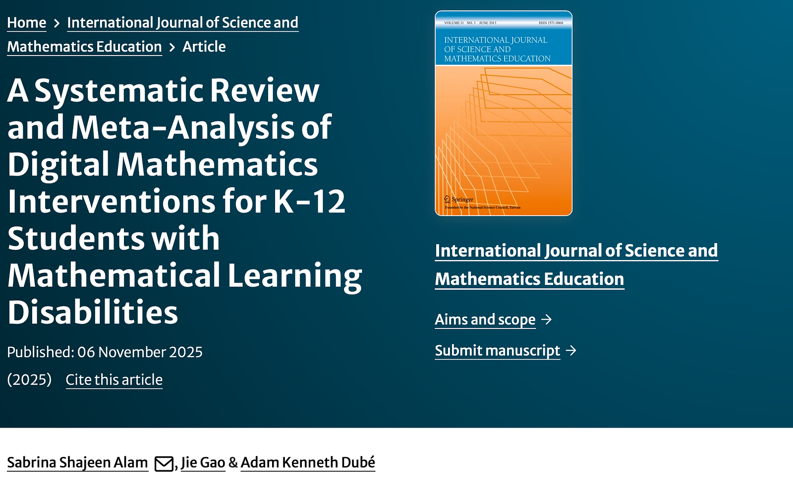 Alam, S. S., Gao, J., & Dubé, A. K. (2025). A Systematic Review and Meta-Analysis of Digital Mathematics Interventions for K-12 Students with Mathematical Learning Disabilities. International Journal of Science and Mathematics Education.https://doi.org/10.1007/s10763-025-10617-z